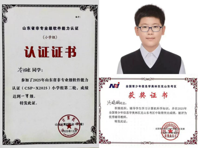 济南市学生任怡然获得省计算机科学奥林匹克竞赛冠军。